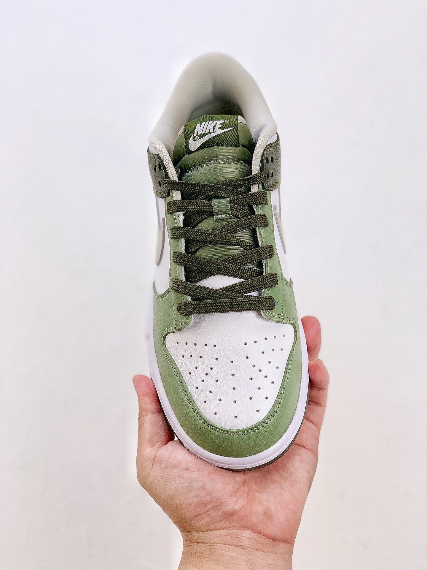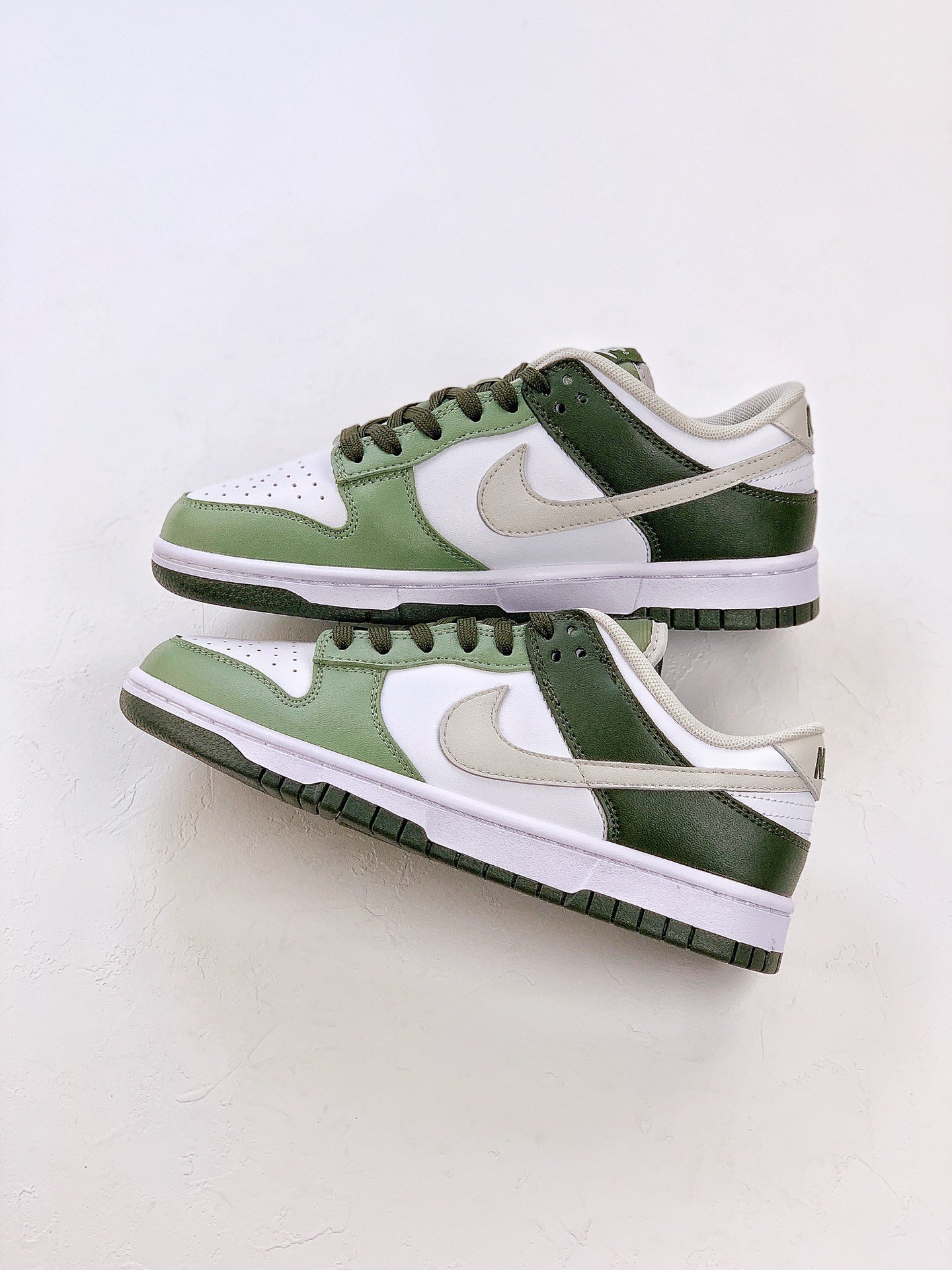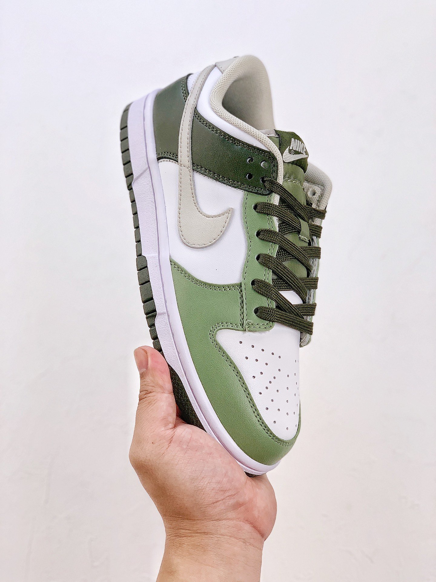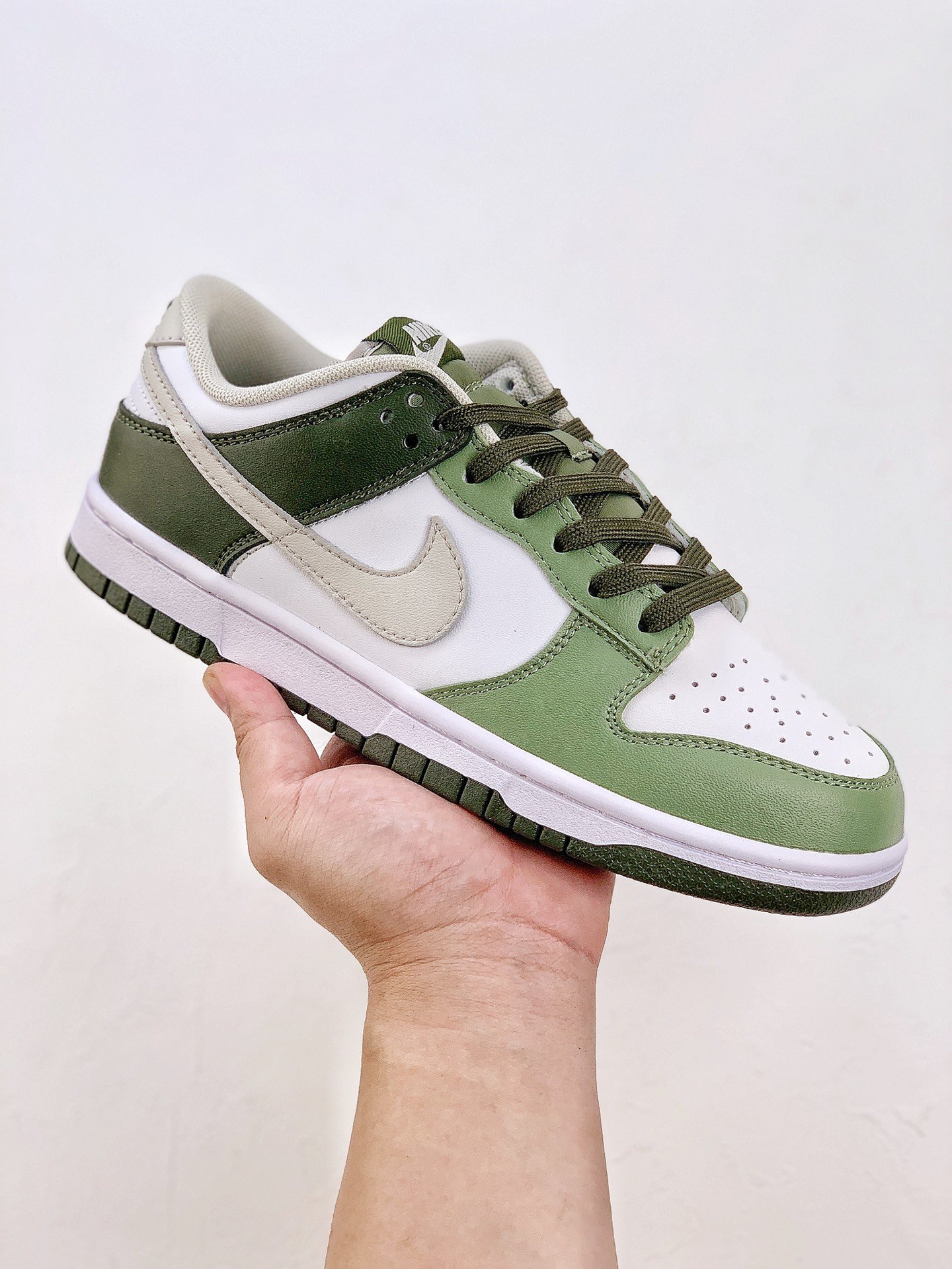 The green bean color scheme is a pair of shoes with a green style. On the basis of the leather upper, different green colors are used for splicing and matching, and white is used to increase the sense of layering. In addition, the Swoosh on both sides of the shoe and the lining are also added with light khaki, presenting a new visual experience